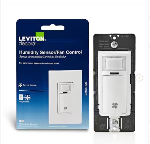 “Leviton Decora In-Wall Humidity Sensor for Bathroom Exhaust Fan Control Switch, 1/4 HP, Residential Grade, Single Pole, White”